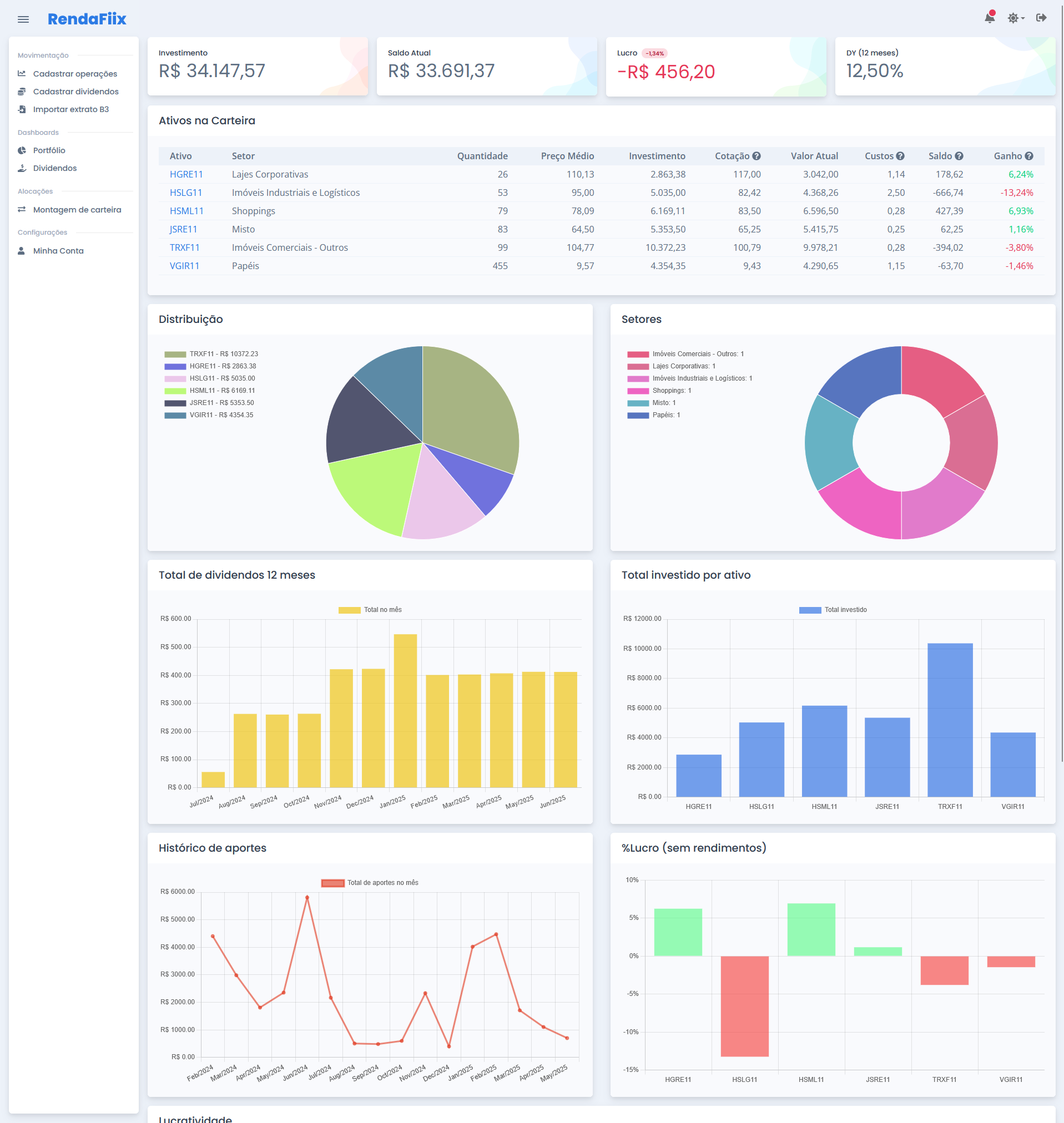 A plataforma calcula DY, lucratividade e saldo atualizado, exibindo gráficos por setor e histórico de aportes.